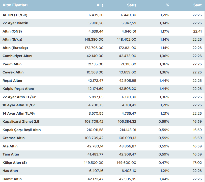Cumhuriyet altını alış fiyatı 42.140,00 lira, satış fiyatı 42.472,00 lira bandında işlem gördü. Bu kategoride de yüzde 1,36 oranında yükseliş kaydedildi. Reşat altını ve kulplu Reşat altını gibi çeşitlerde alış fiyatları sırasıyla 42.172,47 lira ve 42.174,69 lira olarak belirlenirken, satış fiyatları 42.504,95 lira civarına yükseldi.