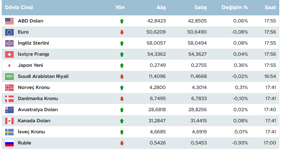 Diğer önemli para birimleri de benzer trendler izliyor. İsviçre Frangı alış 54,4076 TL, satış 54,4393 TL ve yüzde 0,18 artışla dikkat çekiyor. Japon Yeni alış 0,2743 TL, satış 0,2750 TL seviyesinde yüzde 0,18 yükselirken, Kanada Doları alış 31,2849 TL, satış 31,4417 TL ile yüzde 0,08 oranında artıyor. Avustralya Doları alış 28,6809 TL, satış 28,8247 TL ve yüzde 0,02 değişim gösteriyor. Suudi Arabistan Riyali alış 11,4104 TL, satış 11,4676 TL ile yüzde 0,01 düşüş yaşarken, Rus Rublesi alış 0,5427 TL, satış 0,5455 TL ve yüzde 0,91 gerilemeyle öne çıkıyor.