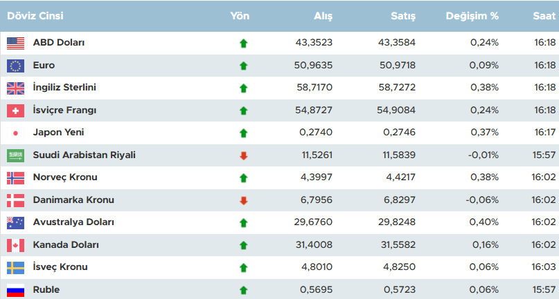 Suudi Arabistan Riyali'nde ise alış 11,5274 TL, satış 11,5852 TL seviyesinde sabit kaldı. Değişim oranı yüzde 0,00 olarak kaydedilirken, güncelleme saati 00:24 itibarıyla riyal istikrarlı bir seyir izliyor.