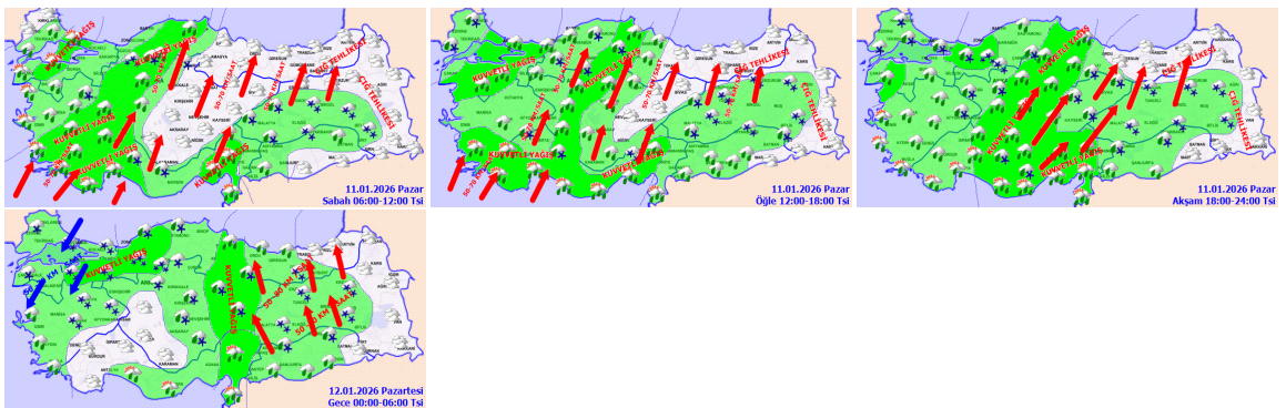 Genel hava durumu tahmini, önümüzdeki günlerde yağışlı bir sistemin etkili olacağını ortaya koyuyor. Doğu bölgelerin bazı kısımları hariç geniş bir alanda yağış bekleniyor. Kıyı kesimlerde yağmur ve sağanak şeklinde görülürken, iç bölgelerde karla karışık yağmur ve kar yağışı hakim olacak. Bu yağışlar belirli alanlarda yerel olarak kuvvetli seyrederek ani sel ve su baskını risklerini artırıyor.