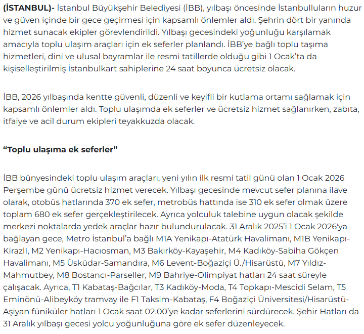 Ücretsiz toplu taşıma uygulaması 1 Ocak boyunca kişiselleştirilmiş İstanbulkart kullanıcılarını kapsıyor ve yılbaşı sonrası dönüşleri rahatlatacak. Şehir Hatları'nın ek seferleri Boğaz'daki kutlamalara katılanlar için büyük kolaylık yaratıyor. İtfaiye ve acil ekiplerin teyakkuz hali ise olası risklere karşı güven veriyor.