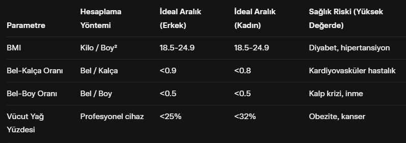 Bu parametreleri bir araya getirerek ideal kiloya ulaşmak, sadece hesaplama değil; sürdürülebilir bir yaşam tarzı değişikliğidir. Fazla yağdan kurtulmak, diyabeti %58, kalp hastalığını %35 önler. Hedefiniz, parametrelerinizin hepsini yeşil zona sokmak olsun. Başlamak için: Günlük kalori alımınızı takip edin, sebze-meyve ağırlıklı beslenin, haftada 3 kez güç antrenmanı yapın. Eğer obezite evresindeyseniz, profesyonel destek alın – cerrahi seçenekler son çare. İdeal kilo yolculuğu, sabır ister; haftalık ilerlemeleri not alın. Vücudunuz teşekkür edecek: Daha iyi uyku, artan enerji ve özgüven.