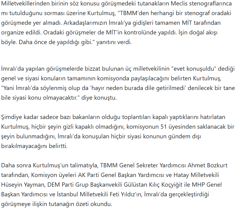 Olayın temeli, 24 Kasım 2025 Pazar günü İmralı Adası'nda gerçekleşen bir görüşmeye uzanıyor. AKP'li Hüseyin Yayman, DEM Parti'li Gülistan Kılıç Koçyiğit ve MHP'li Feti Yıldız'dan oluşan üç milletvekilinin yer aldığı komisyon heyeti, PKK lideri Abdullah Öcalan ile yüz yüze bir araya geldi. Bu görüşme, ses kaydı alınarak tutanağa döküldü ve Türkiye'nin siyasi tarihine not düşülecek bir an olarak kaydedildi. Heyet, ziyaretin ardından detaylı bir rapor hazırlamak üzere çalışmalara başladı; ancak asıl heyecan, bu tutanağın ne ölçüde paylaşılacağı ve içeriğinin nasıl yorumlanacağı etrafında yoğunlaştı. Ziyaret, çözüm süreci bağlamında önemli bir eşik olarak görülüyor, zira benzer girişimler yıllardır umut ve şüphe arasında gidip geliyor.