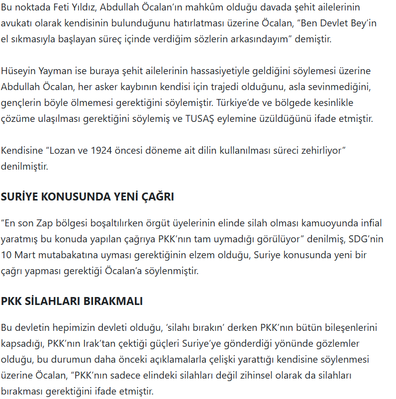 Görüşmede, MHP'li Feti Yıldız'ın şehit ailelerinin avukatı olduğunu hatırlatması üzerine Öcalan, "Ben verdiğim sözlerin arkasındayım" yanıtını verdi. Hüseyin Yayman'ın şehit ailelerinin hassasiyetlerini ve gençlerin ölmemesi gerektiğini vurgulaması, Öcalan'ı TUSAŞ eylemine üzüntüsünü dile getirmeye yöneltti. Lozan öncesi dil politikalarının süreci zehirlediği, Zap bölgesinin boşaltılması sırasında örgüt üyelerinin silahlı olduğu gibi tarihi detaylar da masaya yatırıldı. SDG'nin 10 Mart mutabakatına uyması gerektiği belirtildi; Öcalan ise bu devletin herkesin devleti olduğunu, silah bırakma çağrısının herkesi kapsadığını savundu. PKK'nin sadece mevcut silahları değil, tüm silahları bırakması zorunluluğunu kabul etti ve somut adımlar atılacağını, örgütün lideri olarak tüm gayretini ortaya koyacağını taahhüt etti.