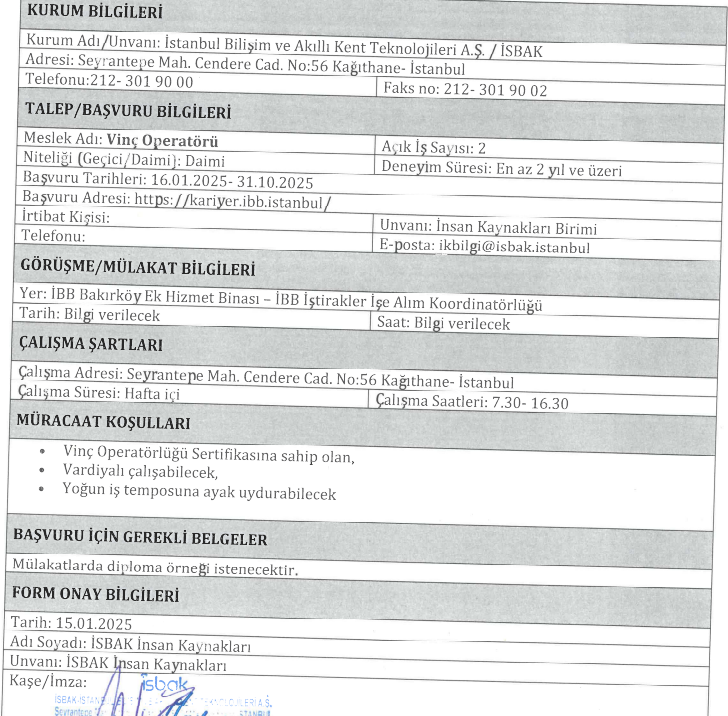 İSBAK'ın açıkladığı vinç operatörü pozisyonu için adayların mutlaka vinç operatörlüğü sertifikasına sahip olması gerekiyor. Ayrıca minimum 2 yıl deneyim şartı aranan pozisyon için vardiyalı çalışma sistemi ve yoğun iş temposuna uyum sağlayabilecek adaylar tercih ediliyor.
