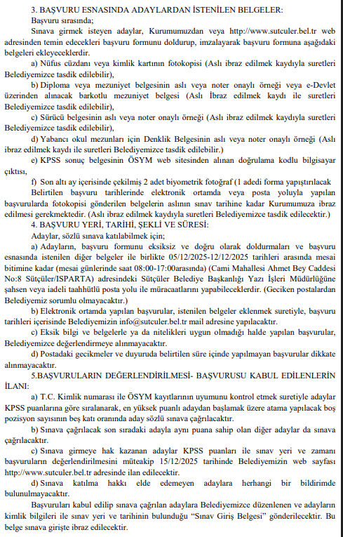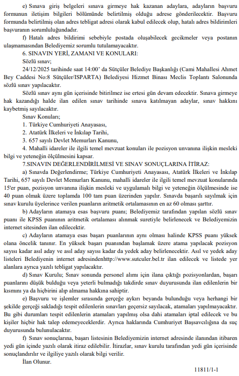 Başvuruların tamamlanmasının ardından, adaylar KPSS puanlarına göre sıralanacak ve en yüksek puandan başlamak üzere kadro sayısının beş katı kadar aday (toplam 5 kişi) sözlü sınava çağrılacak. Sınava girmeye hak kazananların listesi 15/12/2025 tarihinde belediyenin internet sitesinde ilan edilecek. Sözlü sınav ise 24/12/2025 tarihinde saat 14:00'te Sütçüler Belediye Başkanlığı Hizmet Binası Meclis Toplantı Salonunda gerçekleştirilecek. Sınavda adaylara; Türkiye Cumhuriyeti Anayasası, Atatürk İlkeleri ve İnkılap Tarihi, 657 sayılı Devlet Memurları Kanunu, mahalli idareler mevzuatı ve mesleki bilgilerden sorular yöneltilecek. Sınavda başarılı sayılmak için sınav kurulu üyelerinin verdiği puanların aritmetik ortalamasının en az 60 olması gerekiyor.