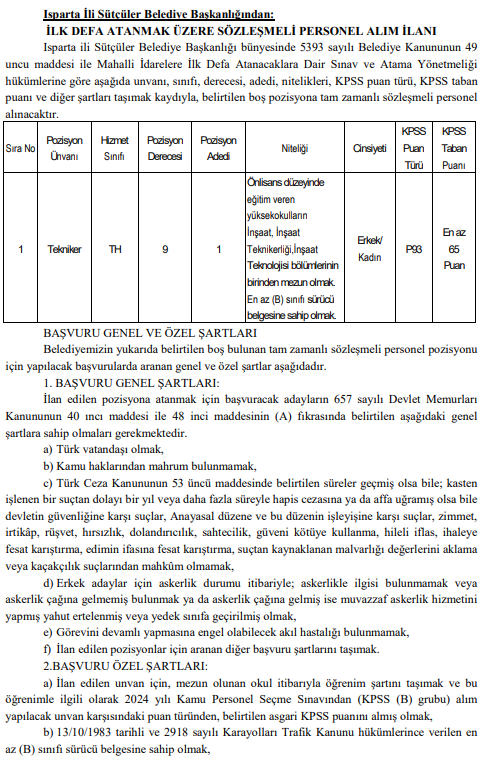 Resmi ilana göre, Isparta'nın Sütçüler Belediyesi, bünyesindeki teknik personel ihtiyacını karşılamak üzere harekete geçti. Belediye, "Tekniker" ünvanıyla tam zamanlı sözleşmeli personel istihdam edecek. Teknik Hizmetler (TH) sınıfında ve 9. derecede görevlendirilecek olan bu personel için 1 adet boş kadro ayrıldığı belirtildi. Alınacak personelin belediyenin fen işleri ve imar süreçlerinde aktif rol oynaması ve ilçenin gelişimine teknik bilgisiyle katkı sunması bekleniyor. Kadın ve erkek adayların her ikisinin de başvurabileceği bu pozisyon için fırsat eşitliği sunulurken, adayların mesleki yetkinliklerini belgelemeleri büyük önem taşıyor.