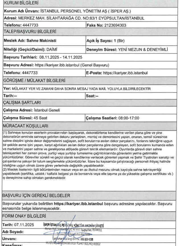 İstanbul'un kültürel ve sanatsal yaşamına destek veren kurumlardan biri olan İSTANBUL PERSONEL YÖNETİM A.Ş. (İSPER A.Ş.), kadrosunu güçlendirmek ve hizmet kalitesini artırmak amacıyla yeni bir istihdam duyurusu yayımladı. İlan, İŞKUR tarafından EK-1 Kurum Dışı Kamu İşçi Alımı İlan Formu ile resmiyet kazanmıştır.