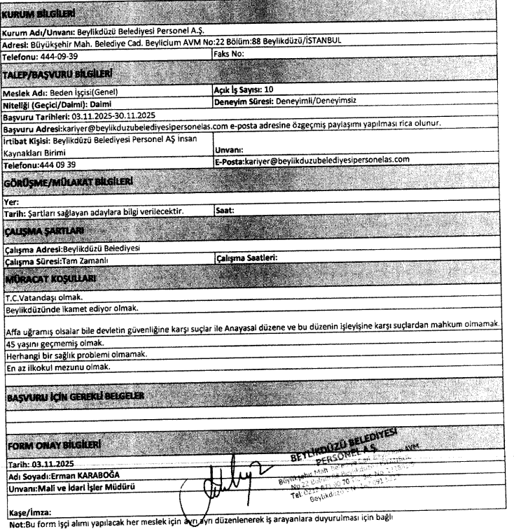İŞKUR tarafından EK-1 Kurum Dışı Kamu İşçi Alımı İlan Formu numarası 202511001 ile kayda alınan bu duyuru, Beylikdüzü'nde yaşayan vatandaşlara büyük bir istihdam kapısı aralıyor.