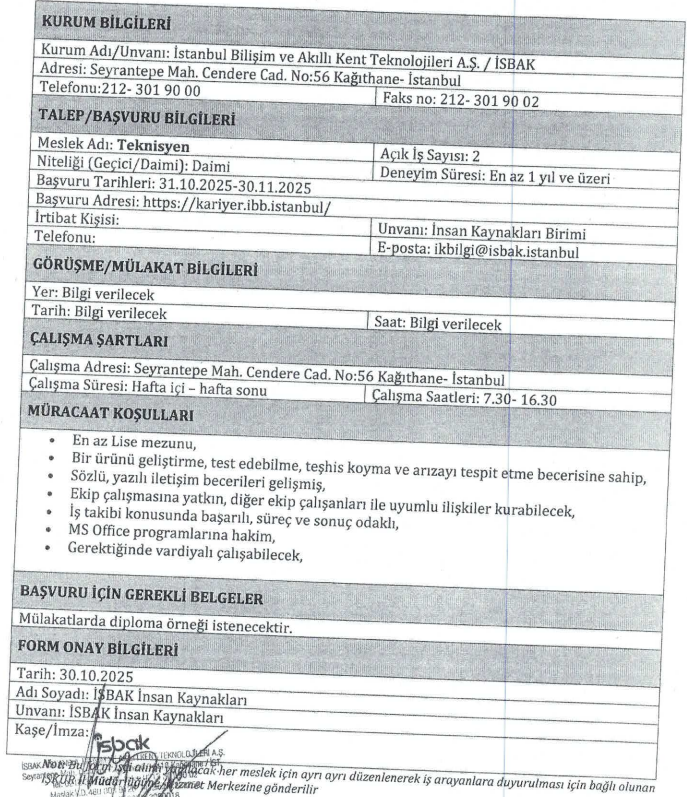 Bu heyecan verici kadroya başvurular, 31 Ekim 2025 tarihinde resmen başladı ve 30 Kasım 2025 tarihine kadar devam edecek. İSBAK’ın Seyrantepe Mahallesi, Cendere Caddesi, No:56 Kağıthane-İstanbul adresinde yer alan çalışma ofislerinde görev alacak teknisyenlerin çalışma saatleri sabah 07.30 ile akşam 16.30 arasında belirlenmiştir. Ancak adayların bu pozisyonda hafta içi ve hafta sonu çalışmaya, hatta gerektiğinde vardiyalı çalışma düzenine uyum sağlayabilecek esnekliğe sahip olması beklenmektedir. Kurum, iş arayanlara sunduğu bu daimi pozisyon ile uzun soluklu bir kariyerin kapılarını aralıyor.