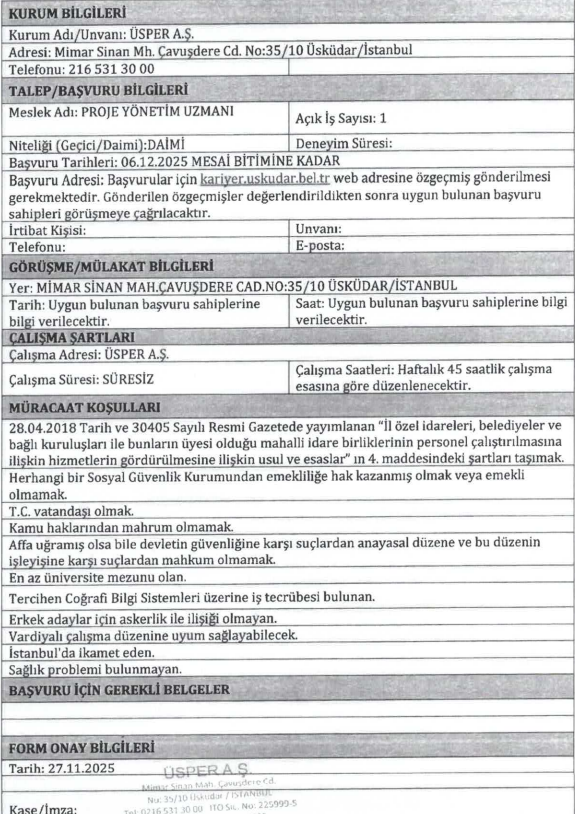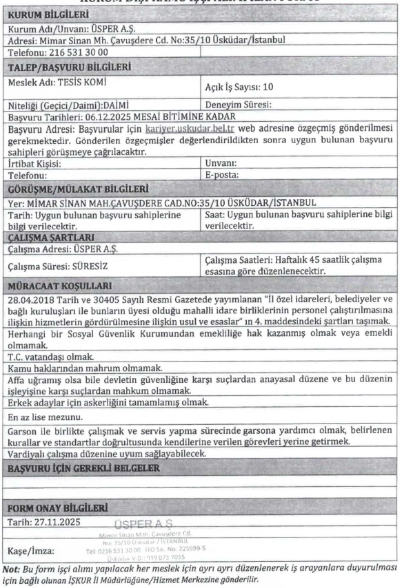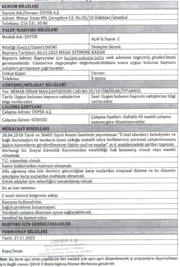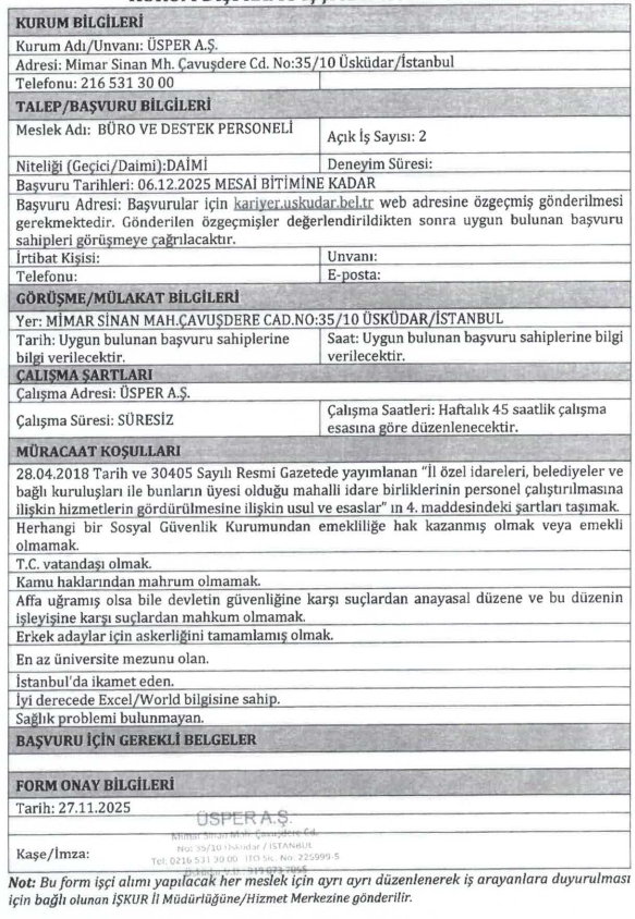 Üsküdar Belediyesi’ne bağlı ÜSPER A.Ş., hizmet kalitesini artırmak amacıyla çeşitli birimlerde görevlendirmek üzere personel istihdamı sağlayacaktır. Alım yapılacak meslek grupları ve kişi sayıları şu şekildedir: