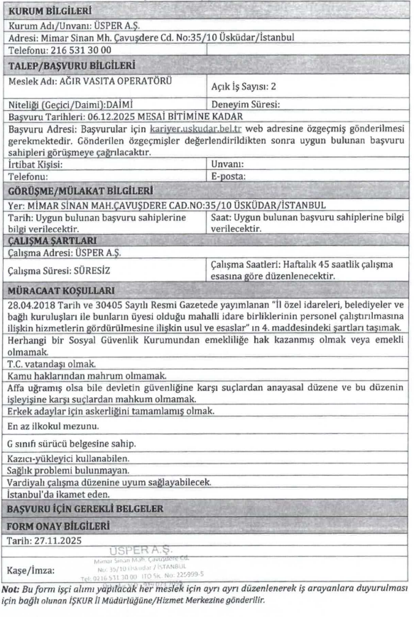 İstanbul Üsküdar Belediyesi iştiraki ÜSPER A.Ş. tarafından yayımlanan son dakika duyurusuna göre, kurum bünyesinde istihdam edilmek üzere 9 farklı meslek grubunda toplam 31 daimi işçi alımı gerçekleştirilecektir. Belediyede çalışmak isteyen adaylar için başvuru süreci resmen başlamış olup, kadrolara göre belirlenen özel ve genel şartlar kamuoyu ile paylaşılmıştır. İşte başvuru tarihleri, kadro dağılımı ve iş ilanına dair merak edilen tüm ayrıntılar.