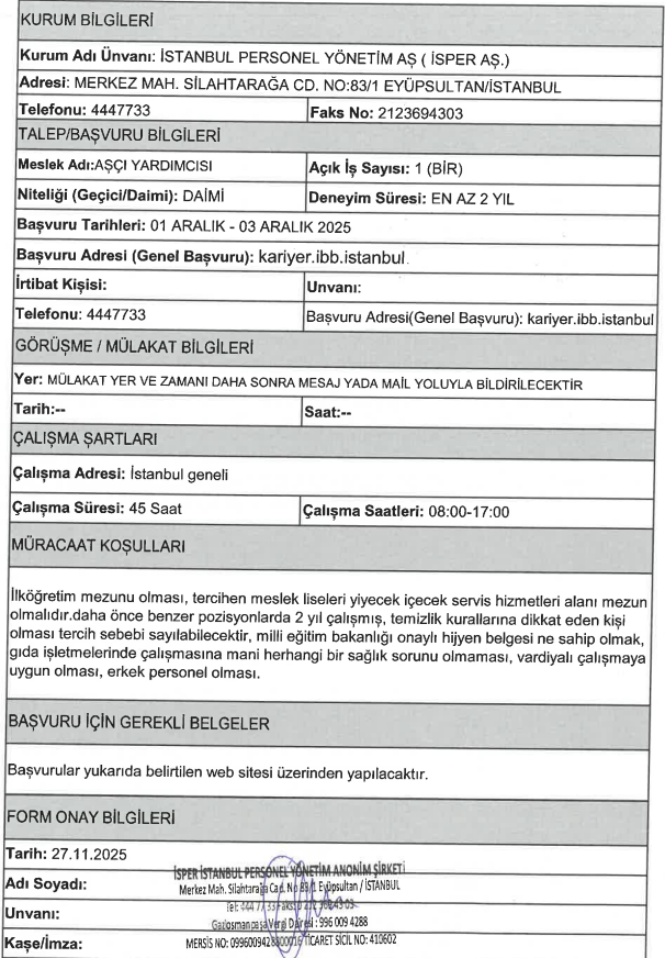 İstanbul'da kamu hizmetlerinde görev almak isteyen vatandaşlar için önemli bir duyuru yapıldı. İstanbul Personel Yönetim Anonim Şirketi (İSPER A.Ş.) bünyesinde daimi statüde istihdam edilmek üzere Aşçı Yardımcısı pozisyonunda personel alımı gerçekleştirilecektir. Bu ilan, Kurum Dışı Kamu İşçi Alımı İlan Formu (EK-1) ile duyurulmuş olup, iş arayanlar için cazip ve kalıcı bir iş imkanı sunmaktadır.