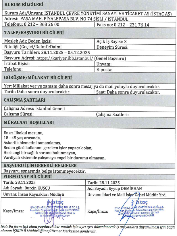 İstanbul genelinde ikamet eden ve kamu sektöründe daimi bir iş hayali kuran vatandaşlar için heyecan verici bir haber geldi. İstanbul'un temiz ve yaşanabilir bir şehir olması için çalışan, İstanbul Büyükşehir Belediyesi (İBB) iştiraklerinden biri olan İstanbul Çevre Yönetimi Sanayi ve Ticaret AŞ (İSTAÇ AŞ), kadrosunu güçlendirmek üzere yeni bir personel alım ilanı yayımladı. Yayımlanan bu önemli ilana göre, İstanbul'un çeşitli bölgelerinde görevlendirilmek üzere toplam 3 kişilik daimi Beden İşçisi pozisyonunda istihdam sağlanacaktır. Kamu işçisi statüsünde gerçekleşecek bu alım, binlerce iş arayan vatandaşın yüzünü güldürecek nitelikte.