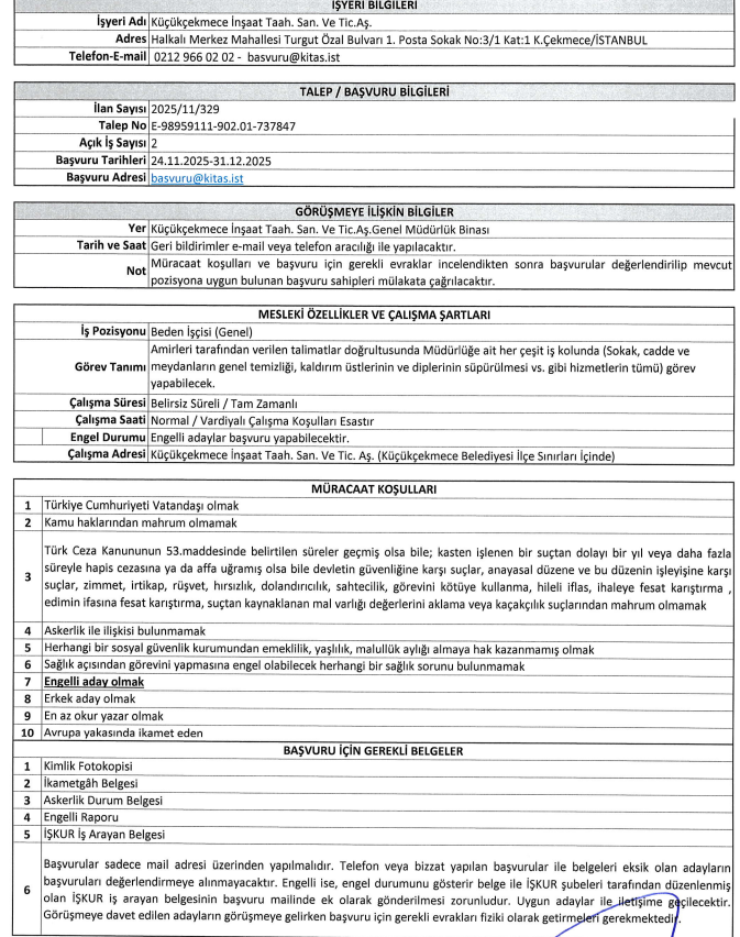 İstanbul’un önemli kamu iştiraklerinden biri olan Küçükçekmece İnşaat Taahhüt Sanayi ve Ticaret A.Ş. (KİTAŞ), İŞKUR üzerinden yayınladığı yeni ilanlarla personel alımı yapacağını duyurdu. Yayınlanan 2025/11/328 ve 2025/11/329 sayılı iş ilanları kapsamında, kurum bünyesindeki eksikliği gidermek amacıyla farklı niteliklerde personel istihdamı sağlanacak. Adayların merakla beklediği bu alım, özellikle Küçükçekmece ilçesinde ikamet eden ve iş arayan vatandaşlar için büyük bir fırsat niteliği taşıyor. İlan metninde belirtilen genel ve özel şartları taşıyan adaylar, başvurularını kurumun belirlediği elektronik posta adresi üzerinden gerçekleştirebilecekler. Başvuruda bulunacak adayların Türkiye Cumhuriyeti vatandaşı olması, kamu haklarından mahrum bulunmaması ve Türk Ceza Kanunu’nun ilgili maddelerinde belirtilen suçlardan hüküm giymemiş olması gerekmektedir. İŞKUR tarafından yayınlanan resmi ilan yada ilanlar makalenin aşağısında verilmiştir.