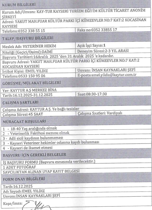 Kayseri merkezli faaliyetlerini yürüten Kay-Tur Kayseri Turizm Eğitim Kültür Ticaret Anonim Şirketi bünyesinde istihdam edilmek üzere, profesyonel kadroya dahil edilecek yeni çalışma arkadaşları aranmaktadır. Bu kapsamda, özellikle hayvan sağlığı ve refahı konusunda uzmanlaşmış, vizyoner bir bakış açısına sahip Veteriner Hekim kadrosu için alım yapılacağı duyurulmuştur. Söz konusu pozisyonun "daimi" statüde olması, adaylar için uzun soluklu ve güven verici bir iş imkanı sunmaktadır. Toplamda 1 adet açık kontenjanın bulunduğu bu özel fırsatta, profesyonel birikimlerini sahaya yansıtacak yetkin isimler öncelikli hedef kitledir.