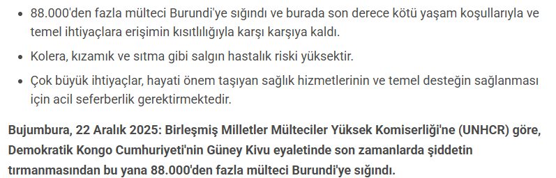 Kongo Demokratik Cumhuriyeti'nin Güney Kivu eyaletindeki şiddet olaylarının tırmanması, on binlerce insanın kaçmasına neden oldu. Aralık ayı başından itibaren 88 binden fazla mülteci, güvenlik arayışıyla komşu ülkeye sığındı. Bu ani akın, kampları doldururken temel hizmetleri zorladı. İnsanlar son günlerde de gelmeye devam ederken, çamur kaplı zeminler ve paylaşılmış çadırlar günlük hayatı tanımlıyor.