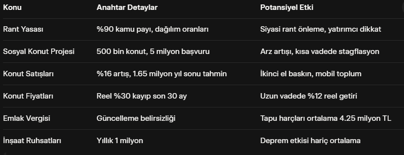 Sosyal konut projesi ise en çok tartışılan konular arasında. TOKİ'nin 500 bin konut hedefiyle başvurular 5 milyonu aşmış durumda. Başvuru ücretleri 5 bin TL'den 7-7.500 TL'ye çıkabilir. Bu proje, özel sektörü dışlayarak crowding out etkisi yaratıyor; küçük ilçelerde özel geliştiricilerin kapasitesini atıl bırakıyor. Kısa vadede talep beklemede kalıp fiyatları stagflasyona sokabilir, uzun vadede ise arz artışı ile denge sağlayabilir. Malzeme ve iş gücü maliyetleri deprem dayanıklılığı nedeniyle yükselirken, atıl kapasiteyi değerlendirme fırsatı sunuyor.