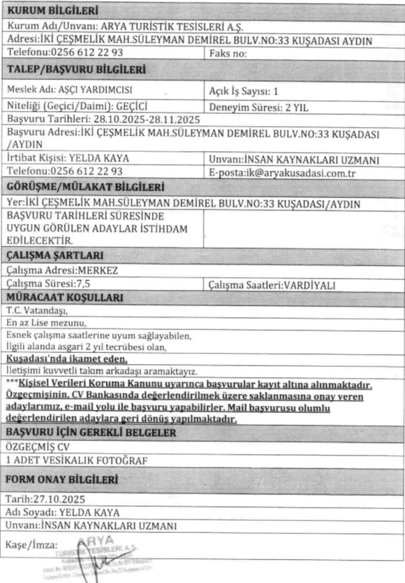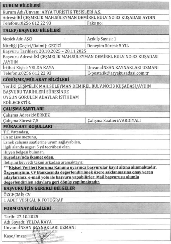 Başvurular, ilan yayınlandığı andan itibaren başlayıp 28 Kasım 2025 Cuma günü saat 17:30'a kadar sürecek. İlk başvuru tarihi olarak 28 Kasım 2025'in kendisi işaret ediliyor, yani adayların vakit kaybetmeden harekete geçmesi öneriliyor. Bu kısa süre, özellikle sezon hazırlıklarının yoğunlaştığı bir dönemde, hızlı bir eleme ve yerleştirme sürecini işaret ediyor. Başvuru yeri, Arya Turistik Tesisleri A.Ş.'nin merkez ofisi olan İki Çeşmelik Mahallesi Süleyman Demirel Bulvarı No:33, Kuşadası/Aydın adresi. Adaylar, şahsen başvurmak zorunda; online veya posta yoluyla kabul edilmiyor. Gerekli belgeler arasında resimli özgeçmiş veya iş başvuru formu ile 1 adet vesikalık fotoğraf yer alıyor. Bu belgeleri hazırlayan adaylar, ofise giderek formu doldurup teslim edebilecek. İŞKUR'un bu tür ilanlarında olduğu gibi, başvuru sırasındaki herhangi bir eksiklik, süreci etkileyebilecek nitelikte. Bu nedenle, belgelerin eksiksiz olması kritik önem taşıyor.