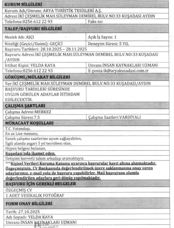 Aydın’ın Kuşadası ilçesinde faaliyet gösteren Arya Turistik Tesisleri A.Ş., belediyeye bağlı olarak 2025 yılı Kasım ayında yeni iş ilanlarını duyurdu. Belediye bünyesinde çalışmak isteyenler için ilan edilen bu alım kapsamında toplamda 1 Aşçı ve 1 Aşçı Yardımcısı geçici süreyle istihdam edilecek.