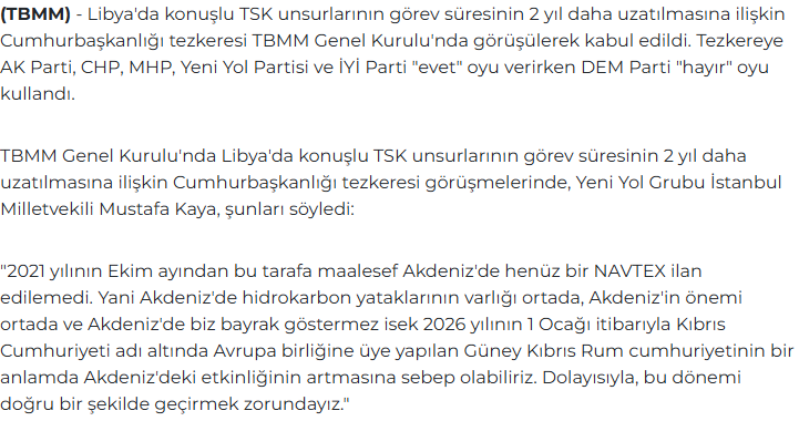 TBMM Genel Kurulu'nda, Türk Silahlı Kuvvetleri unsurlarının Libya'daki görev süresinin 2 Ocak 2026 tarihinden itibaren 24 ay daha uzatılmasına ilişkin Cumhurbaşkanlığı tezkeresi görüşüldü ve kabul edildi. Bu karar, Libya'daki mevcut askeri varlık ve faaliyetlerin devamını sağlarken, Doğu Akdeniz'deki egemenlik hakları ile Kuzey Afrika'daki stratejik konumun korunmasını hedefliyor.