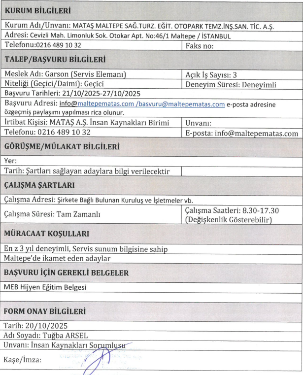 İlan metnine göre, MATAŞ A.Ş., Maltepe/İSTANBUL adresinde konumlanmış olup , bünyesindeki çeşitli kuruluş ve işletmelerde görevlendirmek üzere personel arayışındadır. Bu arayışın odak noktası, Garson (Servis Elemanı) pozisyonudur ve talep edilen açık iş sayısı yalnızca üç (3) ile sınırlıdır. Bu dar kontenjan, başvuru yapacak adaylar arasında nitelikli rekabetin yüksek olacağını göstermektedir. Şirket, bu geçici pozisyon için adayların deneyimli olmasını bir ön koşul olarak belirlemiştir.