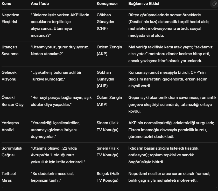 Özlem Zengin'in yanıtı ise tartışmayı bambaşka bir boyuta taşıdı. AKP adına söz alan İstanbul Milletvekili Zengin, kürsüde Günaydın'a dönerek doğrudan meydan okudu: "Bakın sayın Günaydın, gelin hem sizin hem benim birleşik mal varlığımızı inceleyelim. Var mısınız? Size göstereyim, değerli millet arkadaşlarım. Gelin birleşelim, değerli Meclis." Bu teklif, salonda şaşkınlık yarattı; Zengin, mal varlığı üzerinden bir karşı atak yaparak, eleştiriyi kişisel bir seviyeye indirdi. Ardından, sertleşen tonuyla devam etti: "Siz kimsiniz ki bunu konuşuyorsunuz? Kimsiniz? Böyle bir yol yok. Dürüstlüğümün zekâtı size yeter." Zengin'in "zekât" metaforu, dindar bir kesime hitap eden bir savunma stratejisiydi; ancak muhalefet bunu "kibir abidesi" olarak yorumladı. Tartışma kızıştıkça, Zengin utanç sorusuna net bir cevap verdi: "Utanmıyor muyuz diye sorduğunuzda ne cevap bekliyorsunuz? Evet, utanmıyoruz. Gurur duyuyoruz. Yaptığımızdan gurur duyuyoruz. Neden utanalım? Neden utanacağız? Ne utanalım?" Bu itiraf, Halk TV stüdyosunda bile şok etkisi yarattı; sunucu, "Bu kadar açık bir kabul beklemiyorduk" derken, konuklar Zengin'sin sözlerini "normalleşmiş yozlaşma" olarak tanımladı.