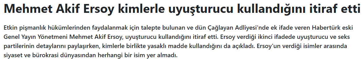 Eski Habertürk Genel Yayın Yönetmeni Mehmet Akif Ersoy, İstanbul Cumhuriyet Başsavcılığı tarafından yürütülen uyuşturucu soruşturması kapsamında 9 Aralık 2025 tarihinde gözaltına alınmıştı. Bu süreçte tutuklanarak Silivri Cezaevi'ne gönderilen Ersoy, etkin pişmanlık hükümlerinden yararlanmak için talepte bulundu. Dün, yani 31 Aralık 2025 öğle saatlerinde Çağlayan Adliyesi'nde ek ifade veren Ersoy, yaklaşık 3 saat süren sorgusunda önemli açıklamalarda bulundu.