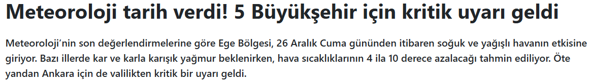 Ayrı bir gelişme olarak, Ankara için de benzer bir soğuk hava uyarısı yapıldı. Hava sıcaklıklarının 6 ila 10 derece azalacağı belirtilirken, il merkezinde 26 Aralık ile 2 Ocak arası en düşük sıcaklığın eksi 3 dereceye kadar düşmesi bekleniyor. Burada da buzlanma, don ve ulaşım aksamaları ile zirai don riski vurgulanıyor.