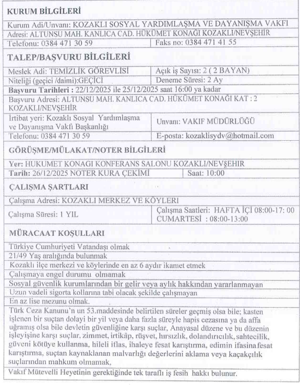 Nevşehir Kozaklı iş ilanı arayanlar için bu fırsat, kaçırılmaması gereken bir şans. Temizlik görevlisi, bakım elemanı gibi pozisyonlar, vasıfsız adaylar için de uygun. Programın sonunda, kazanılan deneyim gelecekteki iş başvurularında fark yaratabilir.