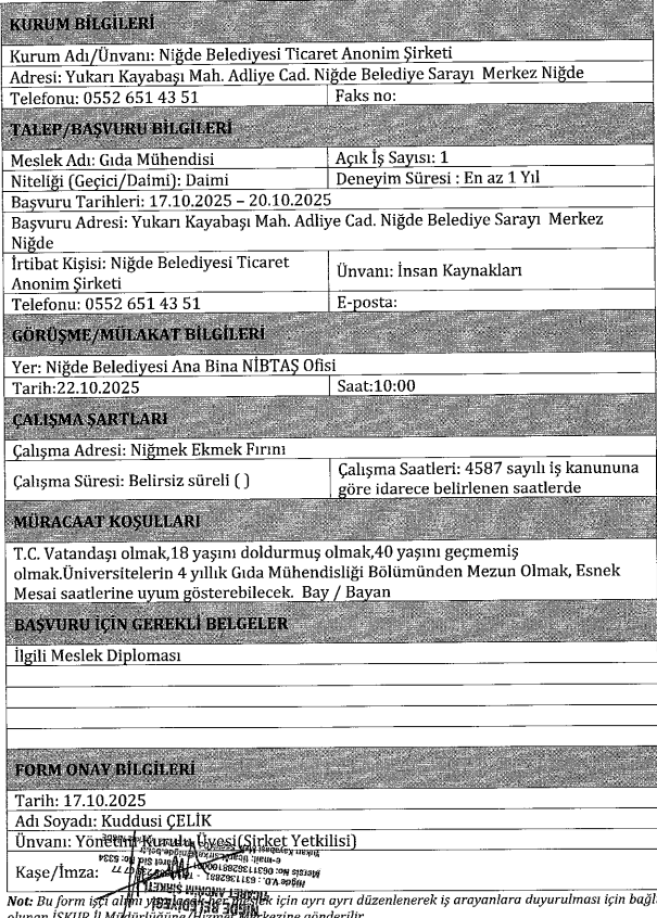 Niğde Belediyesi Ticaret Anonim Şirketi, daimi statüde bir Gıda Mühendisi alımı için ilan yayımladı. Yukarı Kayabaşı Mahallesi, Adliye Caddesi’ndeki Belediye Sarayı’nda faaliyet gösteren kurum, başvurularını 17-20 Ekim 2025 tarihleri arasında alacak. İş başvurusunda bulunmak isteyen adaylar, bizzat Niğde Belediye Sarayı’na müracaat edebilecekler.