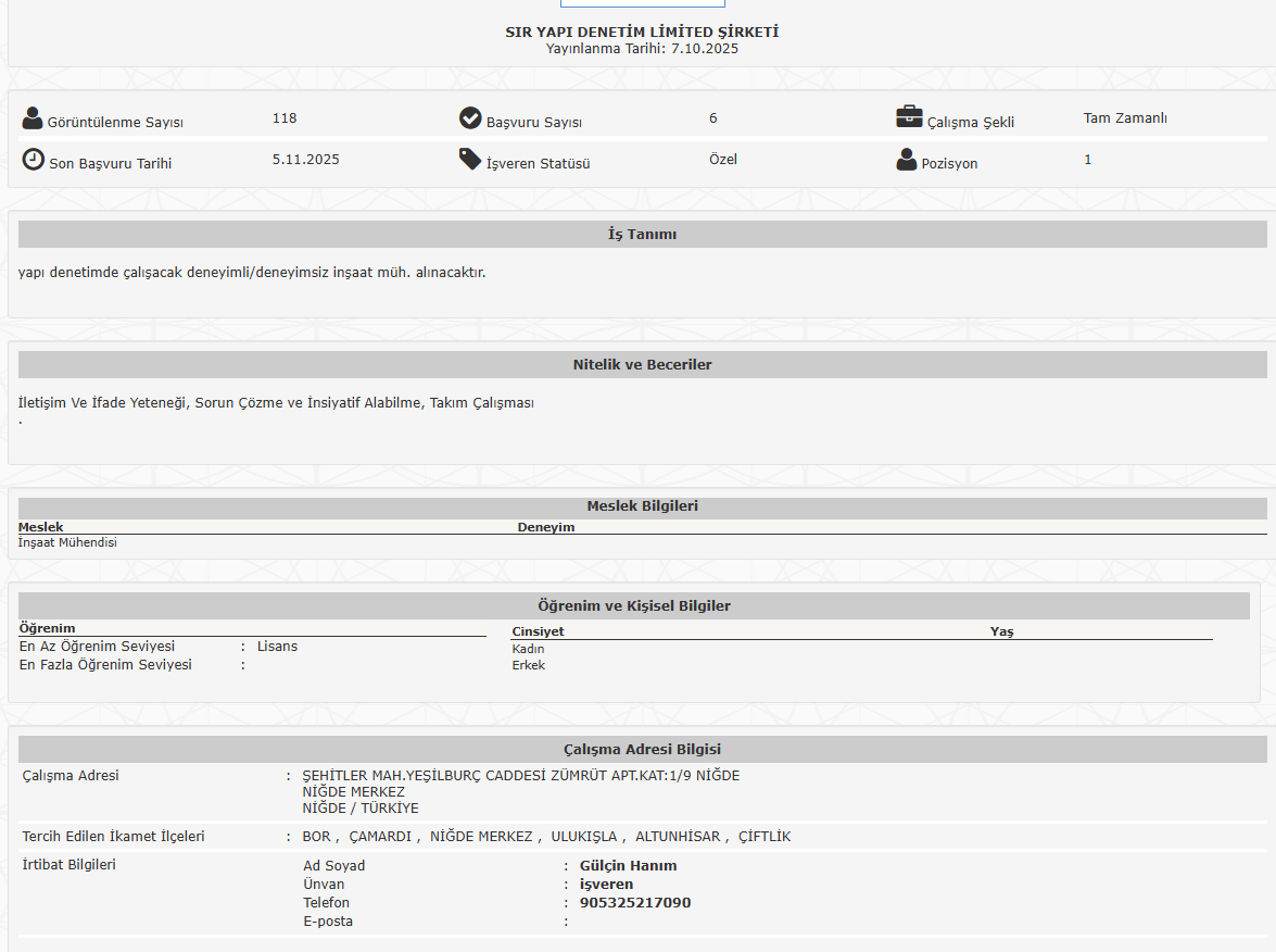 Firmadan Gülcük Hanım ile iletişime geçmek, başvuru öncesi süreci daha iyi anlamaya yardımcı olabilir. Pozisyonla ilgili detaylı bilgi almak, çalışma koşullarını öğrenmek ve beklentileri netleştirmek için arama yapmak mantıklı bir adım. Ancak başvurunun resmi olarak İŞKUR sistemi üzerinden yapılması gerektiği unutulmamalı.