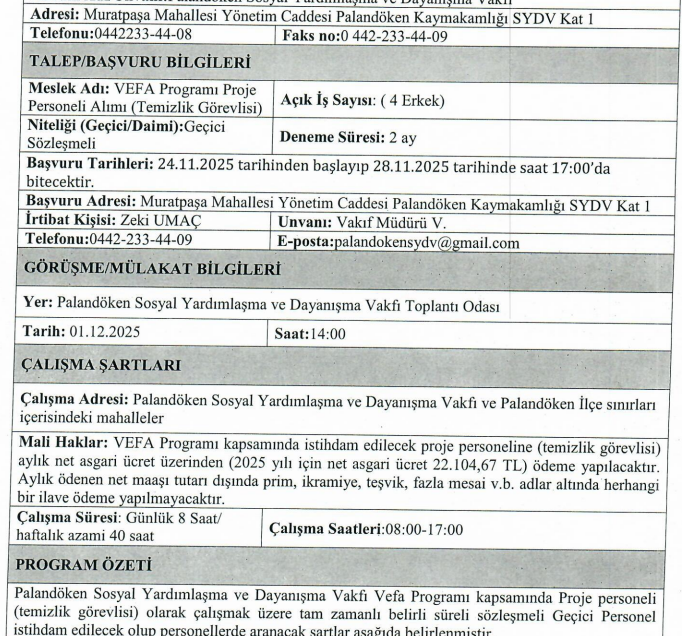 Palandöken Sosyal Yardımlaşma ve Dayanışma Vakfı (SYDV), Erzurum'un Palandöken ilçesinde sosyal hizmetler alanında kritik roller üstlenen bir kurum olarak, 2025 yılı personel alımı ilanını duyurdu. Bu alım, özellikle sosyal yardım ve dayanışma faaliyetlerini güçlendirmek amacıyla gerçekleştiriliyor ve adaylar için prestijli bir kamu istihdamı fırsatı sunuyor. İlan, Aile ve Sosyal Hizmetler Bakanlığı'na bağlı Sosyal Yardımlaşma ve Dayanışma Vakıfları Genel Müdürlüğü aracılığıyla yönetiliyor, bu da sürecin resmi ve şeffaf bir yapıya sahip olduğunu gösteriyor. Uzman kadrosunda istihdam edilecek personelin, ihtiyaç sahibi ailelere yönelik projelerde aktif rol alması bekleniyor. Bu tür alımlar, bölgedeki sosyal hizmet uzmanı ihtiyacını karşılamayı hedeflerken, aynı zamanda genç profesyonellere kapı aralıyor. İŞKUR tarafından yayınlanan resmi ilan aşağıda verilmiştir. Bütün iş ilanlarını görüntülemek için ise bu bağlantıya tıklayınız ya da Google sayfasından aratınız: https://www.bilhaber.com/is-ilanlari.