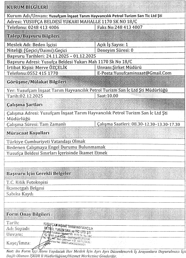 Burdur'un Yusufçam ilçesinde faaliyet gösteren bir hayvancılık firması, sektördeki büyüme ihtiyaçları doğrultusunda yeni personel alımı için harekete geçti. Bu ilan, özellikle hayvan bakımı ve tarım alanlarında kariyer yapmak isteyenler için büyük bir şans sunuyor. İŞKUR'un resmi kanalları üzerinden duyurulan bu fırsat, yerel istihdamı artırmayı hedefleyen önemli bir adım olarak öne çıkıyor. Başvuru süreci basit ve erişilebilir tutulmuş, böylece geniş bir kitleye hitap ediyor. İlan detayları, adayların beklentilerini karşılayacak nitelikte düzenlenmiş; maaş aralıkları rekabetçi, çalışma koşulları ise standartlara uygun. Bu tür ilanlar, Burdur gibi tarım ve hayvancılık ağırlıklı bölgelerde işsizlik sorununa çözüm üretirken, aynı zamanda sektördeki uzmanlaşmayı teşvik ediyor. Adaylar, bu fırsatı değerlendirerek hem istikrarlı bir gelir kaynağı elde edebilir hem de pratik becerilerini geliştirebilir. İlanın yayınlanmasıyla birlikte, bölgedeki iş arayanların ilgisi hızla artmış durumda; erken başvuru yapanlar avantajlı konumda olacak. Hayvancılık sektörünün dinamik yapısı, bu pozisyonları uzun vadeli kariyer fırsatlarına dönüştürme potansiyeli taşıyor. İŞKUR'un bu tür duyuruları, işverenlerle adaylar arasında köprü kurarak ekonomiye katkı sağlıyor. İlan kapsamında belirtilen şartlar, hem deneyimli hem de yeni başlayanlar için esnek tutulmuş, bu da katılımı artırıyor. Burdur'un verimli toprakları ve hayvancılık geleneği, bu iş fırsatlarını daha da cazip kılıyor. Adayların dikkatle incelemesi gereken bu ilan, yerel ekonomiye can suyu olacak nitelikte. İŞKUR tarafından yayınlanan resmi ilan aşağıda verilmiştir.