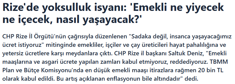 Rize'de CHP İl Örgütü'nün çağrısıyla "Sadaka değil, insanca yaşayacağımız ücret istiyoruz" başlıklı bir miting düzenlendi. Emekliler, işçiler ve çay üreticileri, hayat pahalılığına ve yetersiz ücretlere karşı meydanlara çıktı. Eyleme CHP, Sol Parti, EMEK Partisi, Demokrat Parti, Çay Üreticileri Birliği, Tüm Emekliler Sendikası üyeleri ile ÇAYKUR mevsimlik işçileri ve çok sayıda vatandaş katıldı. İktidarın ekonomi politikalarına tepki gösterilen mitingde, katılımcılar Cumhuriyet Meydanı'nda toplanarak sloganlar eşliğinde Atatürk Caddesi üzerinden Rize İl Kültür ve Turizm Müdürlüğü önüne yürüdü.