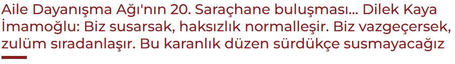 Konuşmasında bir avuç insanın yüzlerce aileye reva gördüğü zulmü kabul etmediklerini vurgulayan İmamoğlu, boyun eğmedikleri ve alışmadıkları için orada olduklarını söyledi. Sadece sevdikleri için değil, demokrasi, özgürlük ve çocuklarının yarınları için mücadele ettiklerini dile getirdi. Herkes için eşit işleyen bir hukuk düzeni talep ederken, yaşanan adaletsizliğin yarın hepimizin kapısını çalabileceğini uyarısında bulundu.