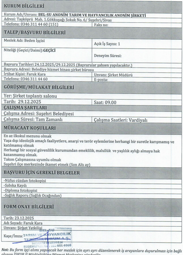 Sivas'ın Suşehri ilçesinde yeni bir personel alım ilanı yayımlandı. İlan, Suşehri Belediyesi'nin bağlı kuruluşu BEL-SU A.Ş. bünyesinde Toplum Yararına Program ile gerçekleştirilecek. Program, belediye hizmetlerinde destek sağlamak amacıyla düzenleniyor ve çeşitli pozisyonlarda katılımcılar aranacak.