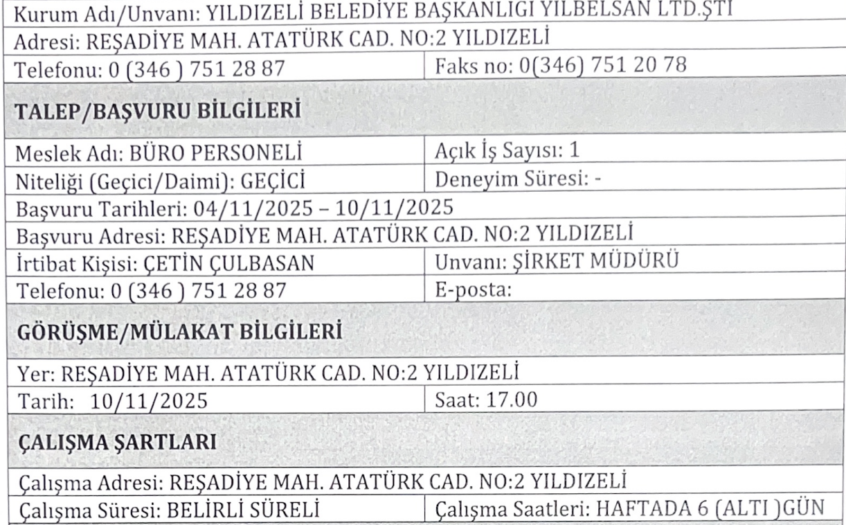 Alım Yapılacak Meslek: Büro Personeli (1 kişi – daimi süreli)
