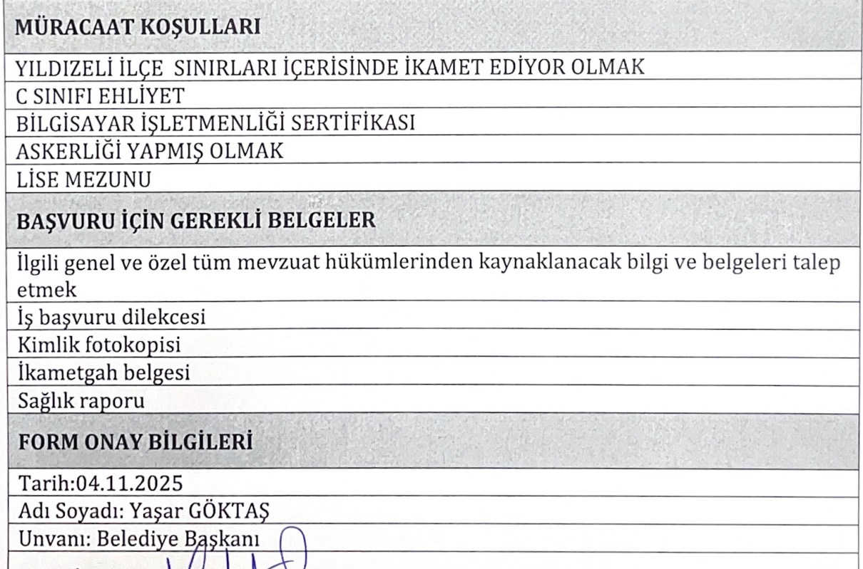 Başvuru Yeri ve Adresi: Yıldızeli Belediyesi ve ilan formunda belirtilen adres