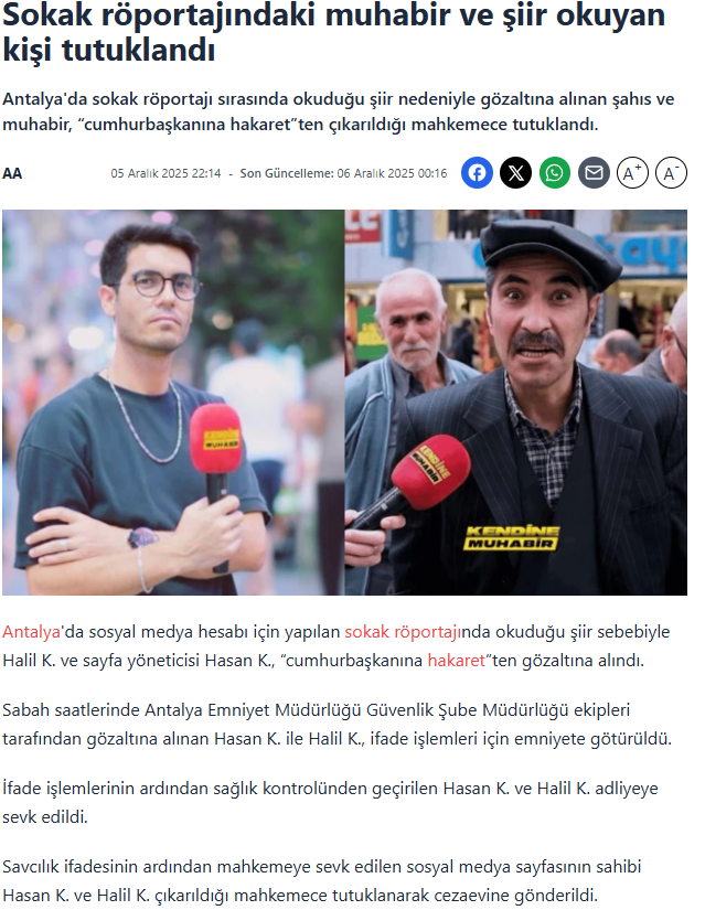 Kronolojik olarak bakarsak, olay 4 Aralık 2025 Perşembe günü öğleden sonra saatlerinde meydana geliyor. Röportaj tamamlandıktan kısa süre sonra, video bir sosyal medya hesabından paylaşılıyor ve saatler içinde on binlerce izlenmeye ulaşıyor. Kamuoyunda "ifade özgürlüğü mü, yoksa suç mu?" tartışmaları başlarken, Antalya Emniyet Müdürlüğü Siber Suçlar Şube Müdürlüğü devreye giriyor. Video analizi yapılıyor ve IP adresleri üzerinden muhabir Murat Çetinkaya ile şiir okuyan A.A.'nın kimlikleri tespit ediliyor. 5 Aralık Cuma sabahı, her ikisi de ayrı ayrı ifadeye çağrılıyor. Çetinkaya, gazetesinin bir çalışanı olarak, röportajın standart prosedürlere uygun olduğunu savunurken, A.A. ise şiirin "kişisel bir ifade" olduğunu ve siyasi bir niyet taşımadığını belirtiyor. Ancak savcılık, videonun "kamu düzenini bozucu nitelikte" olduğunu öne sürerek, her ikisi hakkında da gözaltı kararı veriyor.