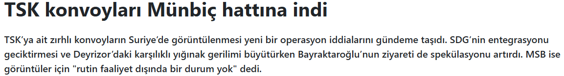 Öte yandan, sahadaki tek hareketlilik TSK unsurlarıyla sınırlı kalmadı. Suriye hükümetine bağlı güçlerin de Deyrizor bölgesine yoğun bir askeri takviye yaptığı gözlemlendi. Dikkat çekici bir diğer ayrıntı ise, bu sevkiyatlar sırasında Türkiye'den elde edilen bazı silah ve sistemlerin de Suriye ordusu askerleriyle birlikte bölgeye gittiğinin görülmesi oldu. Buna karşılık olarak SDG militanlarının da Deyrizor hattına konuşlandığı ve silahlı fotoğraflar paylaştığı belirtildi.