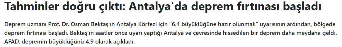 Sonuç olarak, Antalya deprem fırtınası, Prof. Dr. Osman Bektaş'ın vizyoner uyarısının bir zaferi ve Türkiye'nin depremle mücadelesinin bir testi. 4.9 büyüklüğündeki sarsıntı, can kaybı getirmese de, kırılganlıklarımızı ifşa etti. 2020'den beri Alanya-Isparta hattındaki 4-5'lik depremler, büyük bir olayın habercisi; hazırlıksız yakalanmamak için bilim dinlemeliyiz. AFAD'ın verileri, Kandilli'nin ölçümleri ve Bektaş'ın analizleri, hepimizi uyarıyor: Deprem, ne zaman nerede olursa olsun, hazır olmalıyız. Antalya'nın mavi suları sallanırken, umut yeşertelim: Bu fırtına, daha güçlü bir yarın için fırsat olsun. İzlemeye devam edin, çünkü fay hatları sessizce birikiyor – ve bir sonraki uyarı, belki yarın gelir.