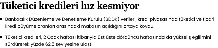 Tüketici kredileri büyümesi, 2 Ocak haftası itibarıyla üst üste dördüncü haftada da yükseliş eğilimini sürdürdü. Yıllıklandırılmış büyüme oranı yüzde 62,5 seviyesine ulaşarak önemli bir eşik aşıldı. Bu performans, kredi talebinin güçlü bir şekilde devam ettiğini ve bireysel borçlanmadaki ivmenin korunduğunu ortaya koyuyor.