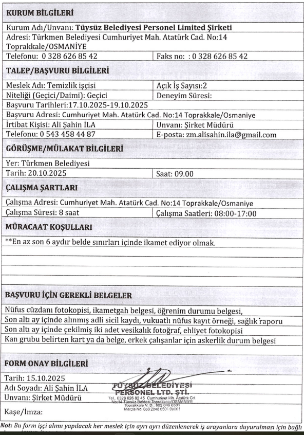 İşçi alımı ilan formu, İŞKUR Osmaniye İl Müdürlüğüne/Hizmet Merkezine ulaştırılarak belirlenen tüm koşullar resmiyet kazanmış bulunuyor. Tüysüz Belediyesi’nde temizlik işçi alımına başvurmak isteyenler için bu bilgiler büyük önem taşıyor. Adayların eksiksiz belgeyle başvuru süreçlerini tamamlamaları gerektiği özellikle belirtiliyor.