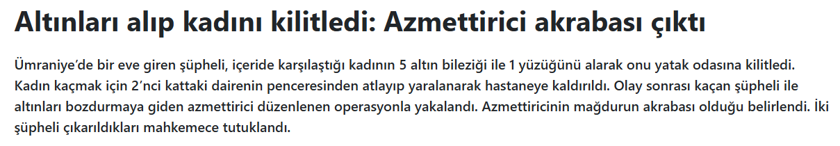 Bu olay, İstanbul'un gasp haritasında Ümraniye'yi bir kez daha öne çıkardı. Semt, son aylarda benzer soygunlarla gündeme gelmişti; yalnız yaşayan kadınlara yönelik saldırılar yüzde 20 artmıştı. Uzmanlar, bu vakaların arkasında maddi çaresizliğin yattığını söylüyor; enflasyonun yüksek olduğu bir dönemde, altınlar kolay hedef haline geliyor. S.F.'nin hikayesi, sadece bireysel bir trajedi değil; toplumsal bir uyarı. Aile bağlarının bile para için koparılabildiği bir gerçeklikte, bireysel güvenlik önlemleri şart: Akıllı kilitler, komşu dayanışması ve polise hızlı ihbar. H.A.F. gibi azmettiricilerin çıkması, güven duygusunu sarsıyor; zira en yakınımızdaki tehlike, en beklenmedik yerden gelebiliyor. Polis, bu dosyanın emsal olacağını belirtiyor; benzer azmettirme vakalarında cezalar ağırlaşacak.