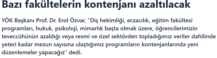 Öğrencilerin teveccüh etmediği programlar yakından izleniyor ve üç yıldır kontenjanı sürekli azalan bölümlerde ciddi kısma yoluna gidiliyor. Geçen yıl devlet üniversitelerinde uygulanan kontenjan azaltmaları, bu yıl vakıf üniversitelerine de genişletilecek. Diş hekimliği, eczacılık, eğitim fakültesi programları, hukuk, psikoloji ve mimarlık gibi bölümler başta olmak üzere, öğrenci talebinin düştüğü veya resmi ile özel sektör verilerine göre yeterli mezun sayısına ulaşılan programlarda yeni düzenlemeler yapılacak.