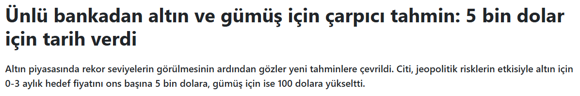 Citi'nin yukarı yönlü revizyonu, kısa vadeli 0-3 aylık dönem için geçerli temel senaryoyu kapsıyor. Banka, bu süreçte jeopolitik tansiyonun altın ve gümüş talebini destekleyeceğini öngörüyor. Rekor seviyelerin ardından gelen kar satışları, kısa vadeli düzeltme olarak değerlendirilirken, temel dinamiklerin güçlü kaldığına dikkat çekiliyor.