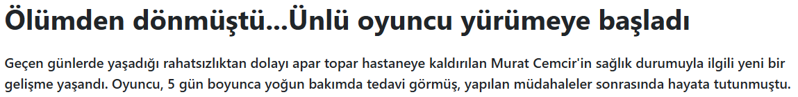 Divertikül kanaması nedeniyle yaşadığı bu zorlu süreç, ünlü oyuncu Murat Cemcir’in ne denli büyük bir tehlike atlattığını gözler önüne serdi. Yoğun bakımda geçen beş günün ardından, yeniden yürümeye başlaması ve Pazartesi günü taburcu olma ihtimali, Cemcir'in sağlığına kavuşma mücadelesinin zaferle sonuçlandığının bir kanıtı oldu. Türkiye, sevilen oyuncusunu yeniden ekranlarda görmeyi heyecanla bekliyor.