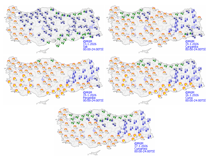 Ayrıca, Doğu Karadeniz'in iç kesimleri ile Doğu Anadolu'nun doğusunda, yüksek kar örtüsüne sahip eğimli yamaçlarda çığ tehlikesi bulunmaktadır. Bu bölgelerde yaşayan veya seyahat edecek olan vatandaşların, mevcut kar örtüsü üzerine yeni yağışların eklenmesi veya rüzgarın etkisiyle oluşabilecek çığ riskine karşı maksimum düzeyde tedbirli olmaları gerekmektedir. Akdeniz kıyılarında ise parçalı ve çok bulutlu, yer yer sağanak yağışlı bir havanın hakim olması, iç kesimlerde ise yağışların karla karışık yağmur ve kar şeklinde görülmesi bekleniyor.